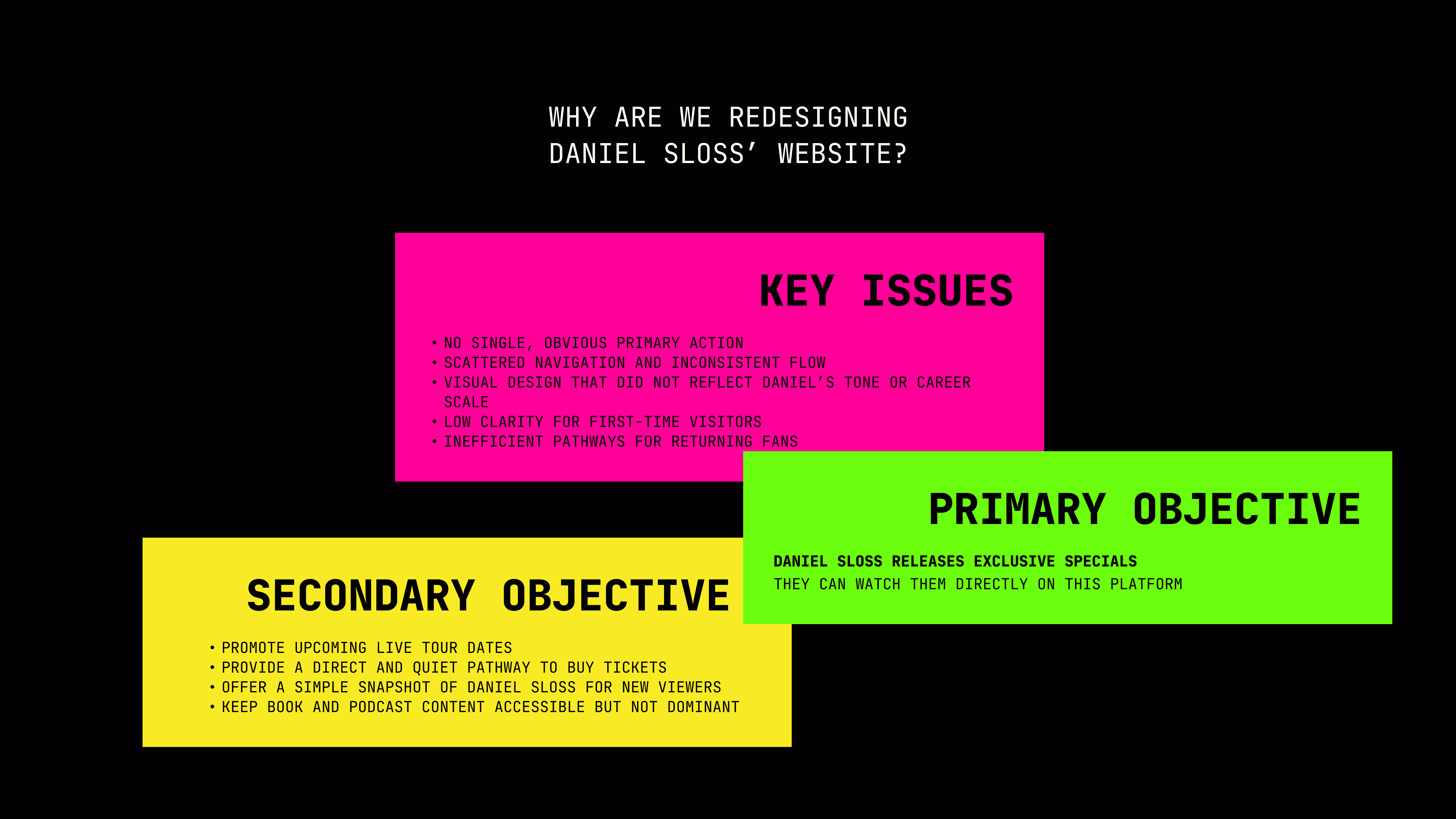 The objective was to explore brand-led product thinking and demonstrating end-to-end UX and UI execution. The existing website attempted to serve too many purposes at once: streaming specials, tour listings, press, news, social links, book promotions, merch, and podcasts. With no clear hierarchy, the homepage felt cluttered and the primary narrative of Daniel’s work was lost.