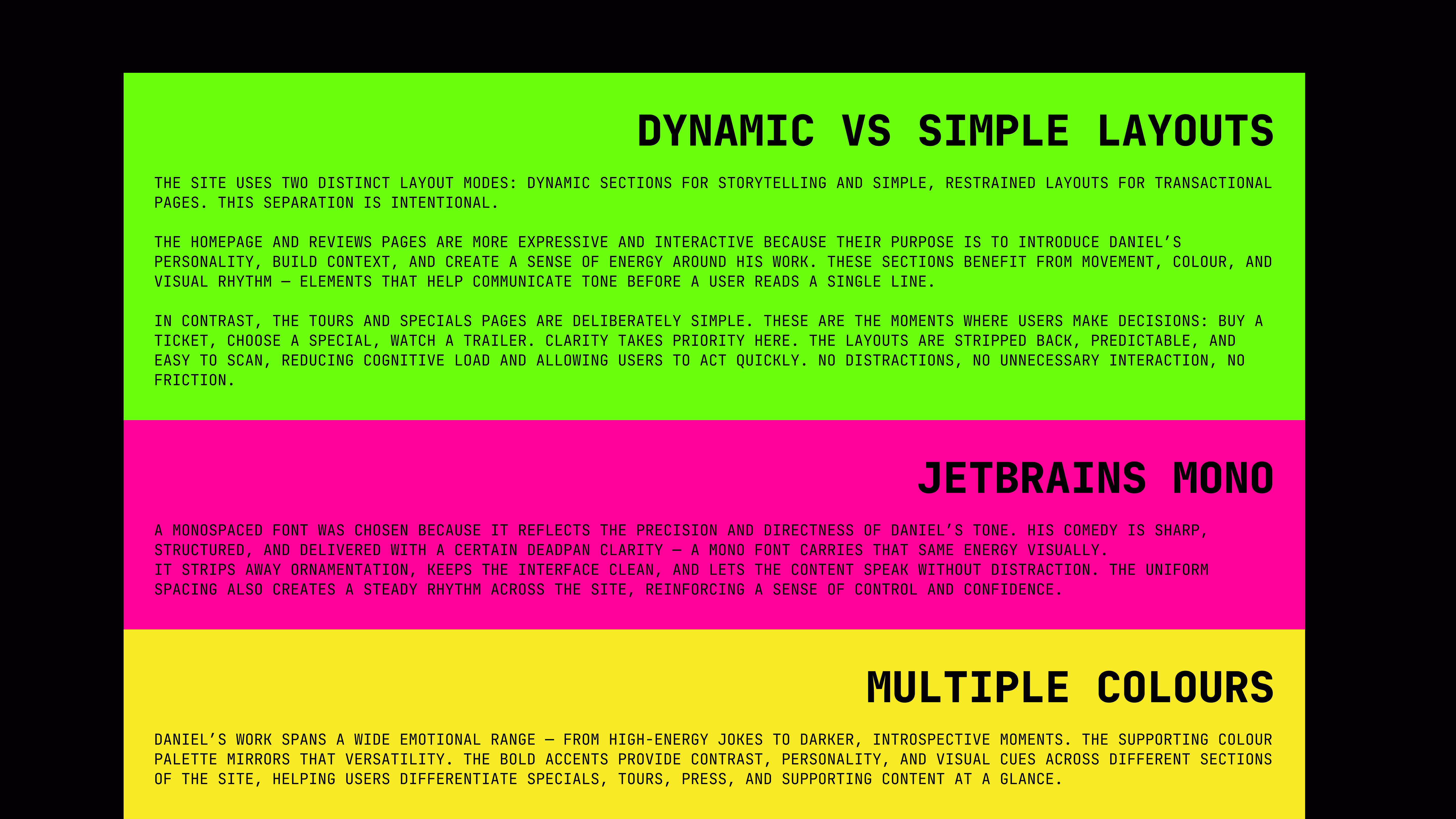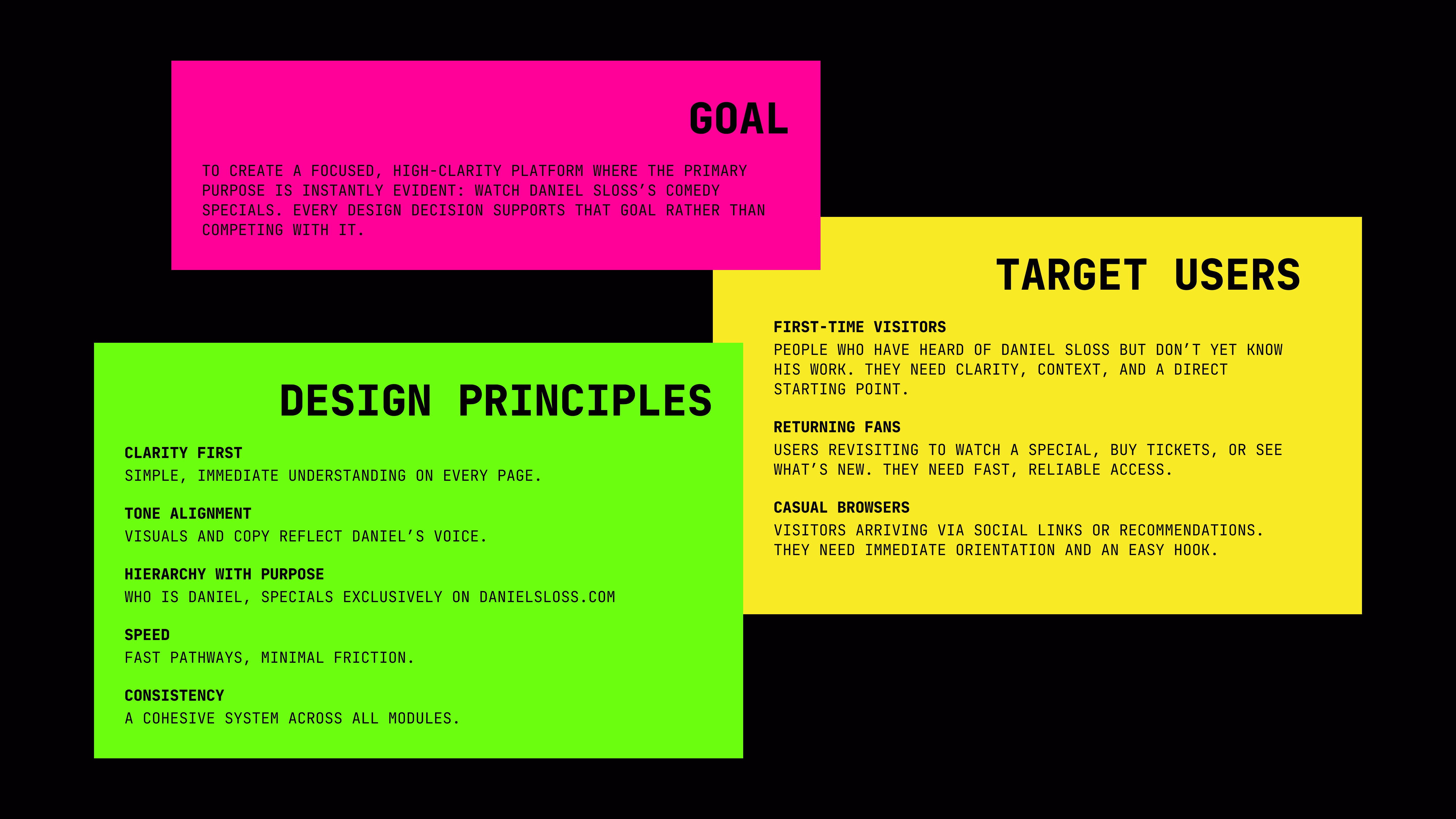 Daniel Sloss’ website was transformed from an outdated, unfocused experience into a modern, structured platform that reflects the scale of his career and the needs of his global audience. The redesign introduces a clear hierarchy, consistent branding, and a streamlined user flow that highlights his comedy specials—the core product—while supporting tours, press, and other essential content.